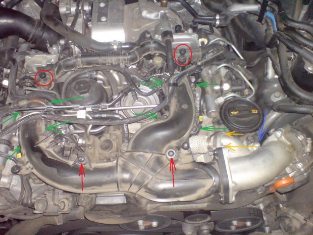 - eraz trzeba odkrĂŞciĂŚ tÂłumik szumĂłw ssania(czerwone strzaÂłki) aby odkrĂŞciĂŚ ÂśrubĂŞ wspornika (zielona strzaÂłka) gdyÂż ten wspornik(niebieska strzaÂłka) jest juÂż zamontowany w nowym kolektorze,
