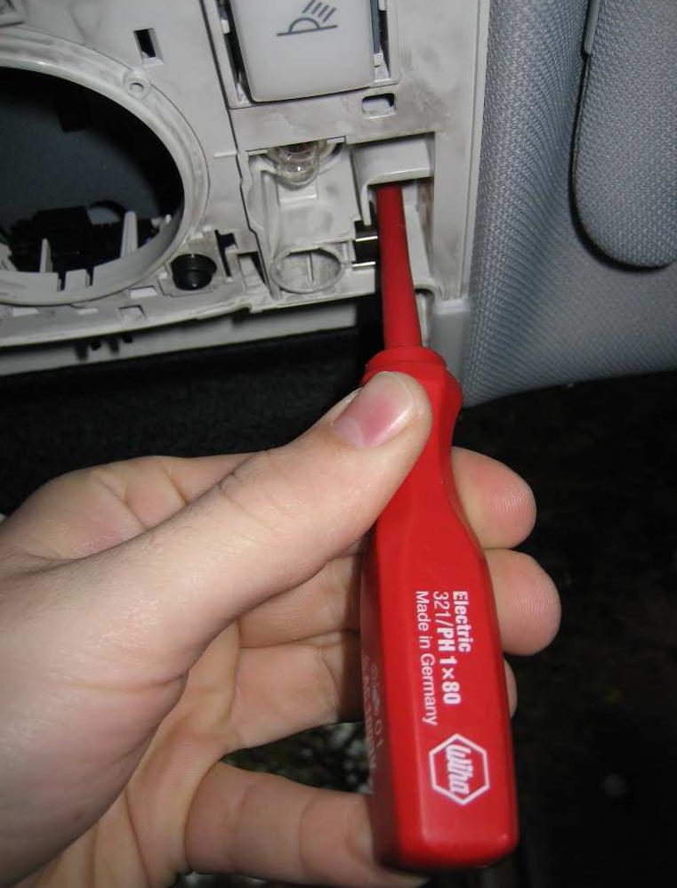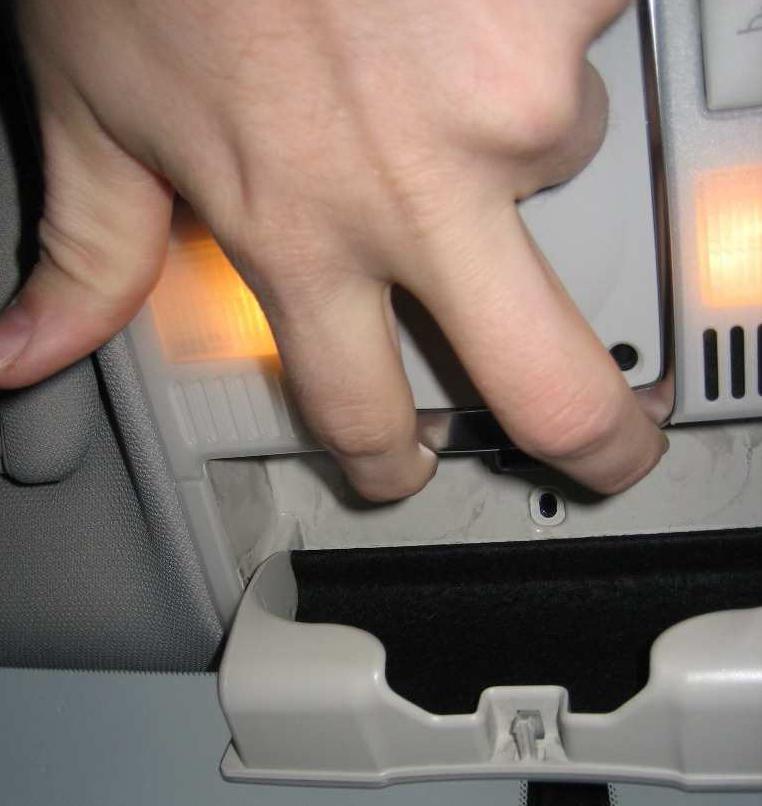 2) Zdemontuj obudowę lampek sufitowych - otwórz schowek na okulary, złap palcami powierzchnię obudowy, delikatnie pociągnij ku dołowi. Następnie wykręć 2 śrubki (krzyżak) - jak na zdjęciu. Następnie - panel w dół...