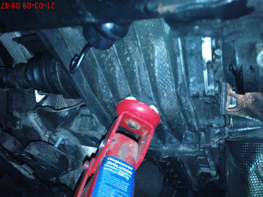 Lewarek podnośnik olejowy podstawiamy pod skrzynię biegów (centralnie na drewnianym klocku lub kawałku gumy ).