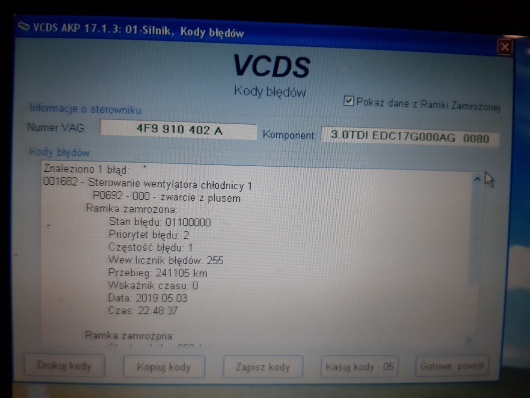 Otóż po zrobieniu krótkiej trasy do miasta ok 55km zauważyłem a raczej uslyszalem chodzacy na pełny gwizdek wentylator cieczy chłodzącej. Po zgaszeniu chodzil jeszcze ok. 1 minuty(jest tak do teraz). Potem bylo parę przemieszczeń po mieście, krótkie odcinki, praktycznie za każdym razem gaszenie i odpalanie auta, po tym powrót także ok 55km. Pierwsza moja myśl dpf, wyjaśnię teraz dlaczego, nie tak dawno miałem taki problem z wentylatorem, zwariowal gdy zatkał się dpf, padła sonda i czujnik temp. za katem. Wtedy po wymianie tych części i wypaleniu serwisowym dpf'a zniknął takze problem z wentylatorem.