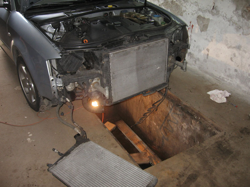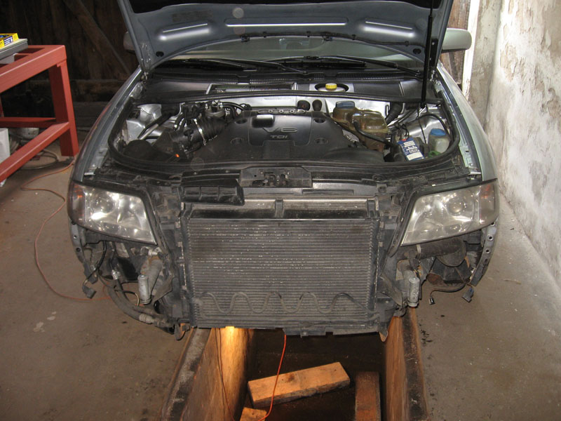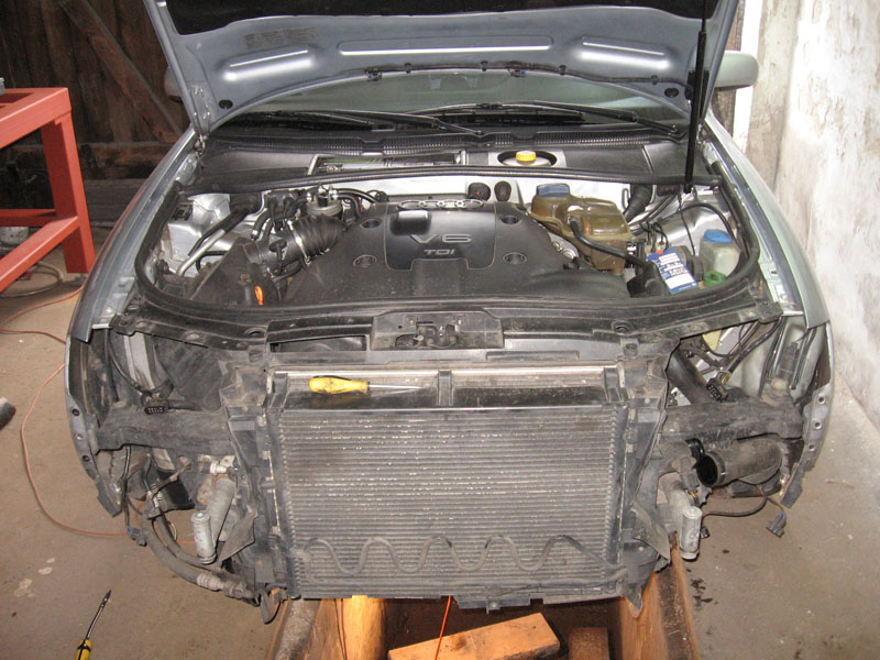 - o ile czegos nie pominalem [moglem zapomniec] to juz w tej chwili mozna wyciagnac wszystkie razem chlodnice do prawego boku i najlepiej postawic na ziemi i oprzec o cos [uwazac przy tym na przewody od klimy, ktorych oczywiscie nie rozkrecamy]