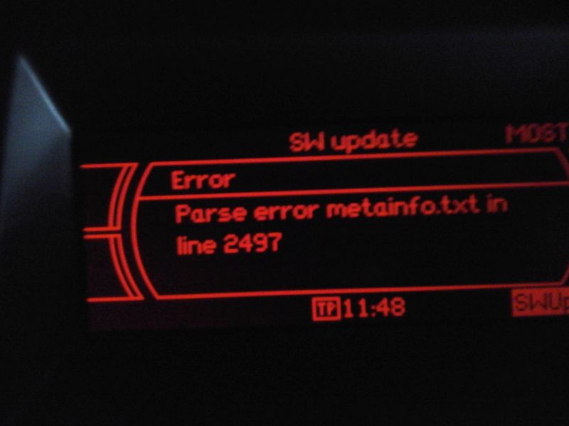 Nagrałem dziś na płytę cd TDK plik aktualizacyjny 2120 z chomika. Po włożeniu płyty do Cd-Rom w aucie i próbie uruchomienia aktualizacji wyskakuje taki komunikat: Parse error metainfo.txt in line 2497. O co chodzi ?